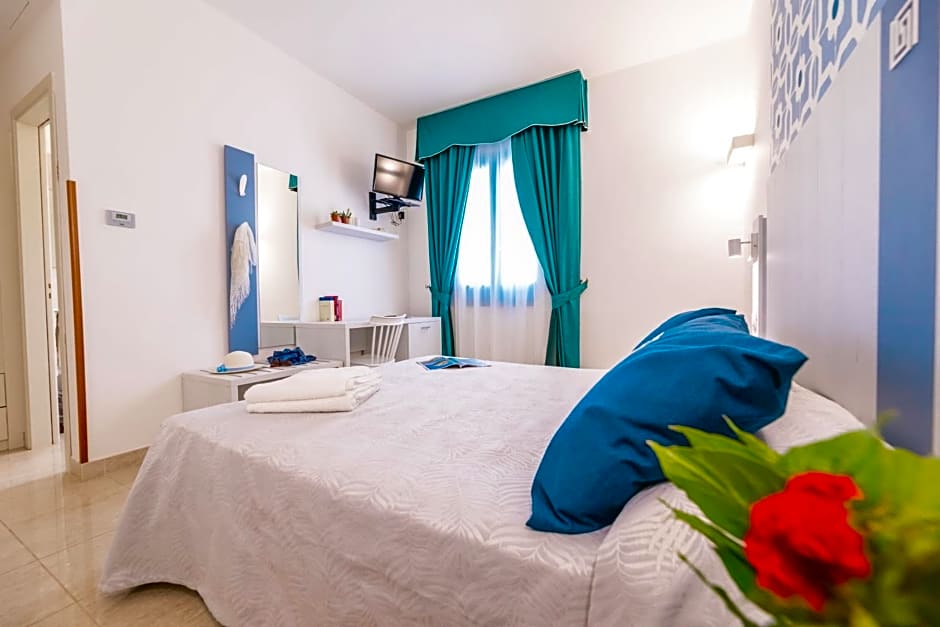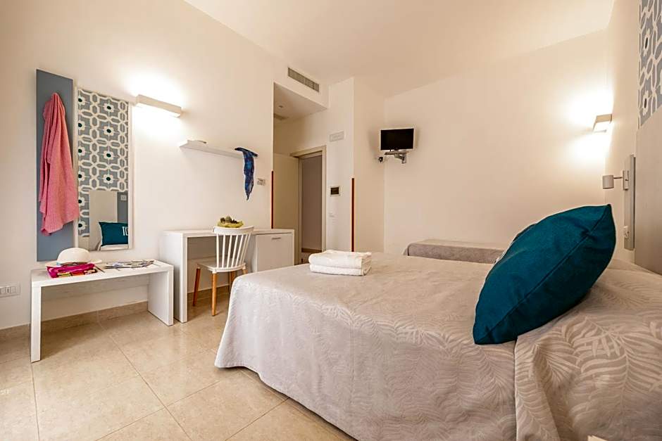 The Suites consist of two bedrooms, with a double bed in one room and twin beds with a door that can be closed in the other. The twin bed room has no window and includes wardrobe and LCD television. All rooms have a specious well-appointed bathroom with bathtub and a furnished balcony with pool or sea side view. The floors in the rooms are tiled.