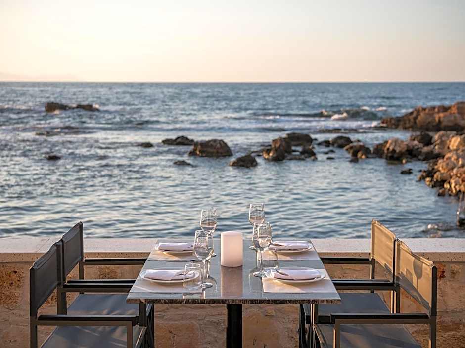 Η εστίαση εντός του ξενοδοχείου επικεντρώνεται στο Periplous Seaside, ένα ελληνικό εστιατόριο της παραλίας με ατμόσφαιρα που κυμαίνεται από φιλική προς οικογένειες έως μοντέρνα και ρομαντική. Προσφέρεται πρωινό, και επιπλέον πρακτικές παροχές περιλαμβάνουν γραφείο εκδρομών, ιδιωτική είσοδο, 24ωρη ρεσεψιόν, δωμάτια για μη καπνιστές, ξαπλώστρες/καρέκλες παραλίας, μπαλκόνια με θέα, δωρεάν είδη περιποίησης και επιμήκη κρεβάτια. Οι επιλογές δωματίων περιλαμβάνουν: Deluxe με θέα στη θάλασσα και μπαλκόνι· Junior Suite Seafront· Family Suite Seafront· Deluxe Suite Seafront με μπαλκόνι· και την Presidential Suite Jacuzzi Seafront με μπαλκόνι, καλύπτοντας διαφορετικές προτιμήσεις ενώ διατηρούν τη θαλασσινή γοητεία.
