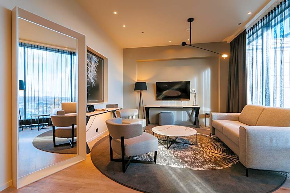 The spacious air-conditioned one-room suites with a city view have one large, high-quality continental bed and comfortable seating area with armchairs and a sofa, which can be turned into an extra bed ideal for up to 2 children. All rooms include TV, mini-bar, safety deposit box and blackout curtains and have parquet floor. Bathroom includes bath and hairdryer. Guests are offered bathrobe and slippers. Guests can enjoy free WIFI, blackout curtains, tea/hot drink set, capsule coffee maker, iron, ironing board and yoga mat. The room rate includes a particularly rich breakfast in the City Grill House restaurant, access to the hotel’s relaxation area and the possibility to use a separate workspace.