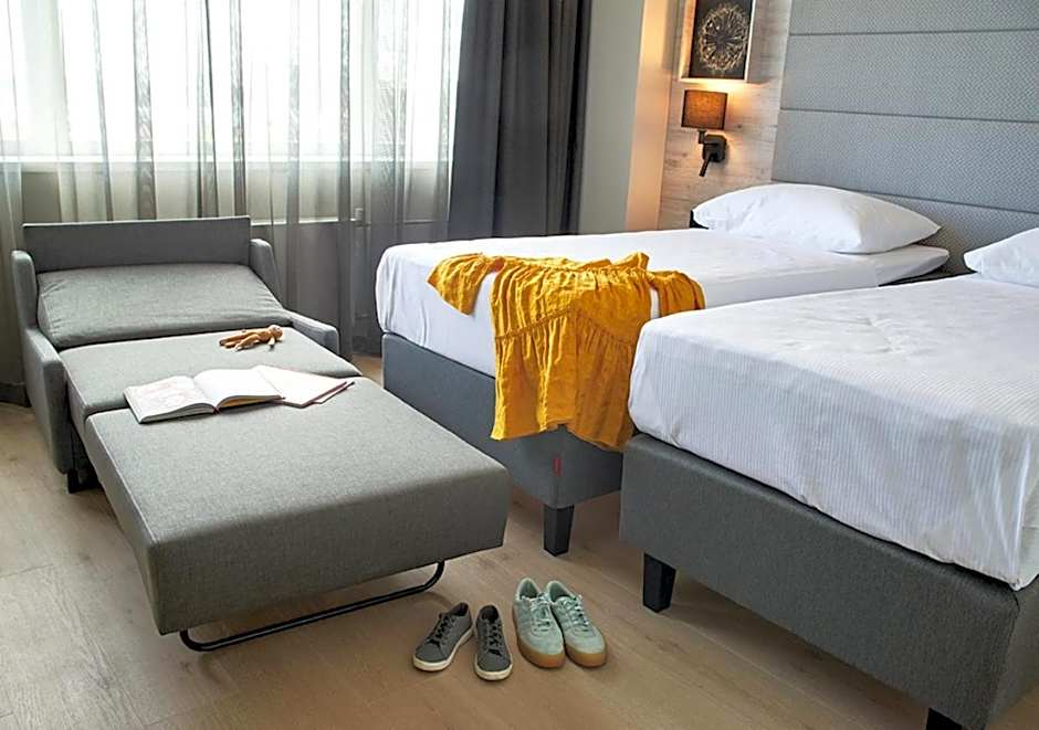 The comfortable air-conditioned twin rooms have high-quality and very comfortable continental beds. All rooms include TV, mini-bar, safety deposit box and blackout curtains and have parquet floor.