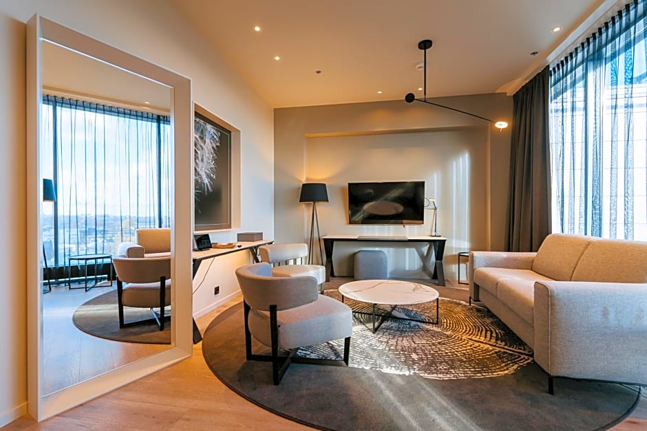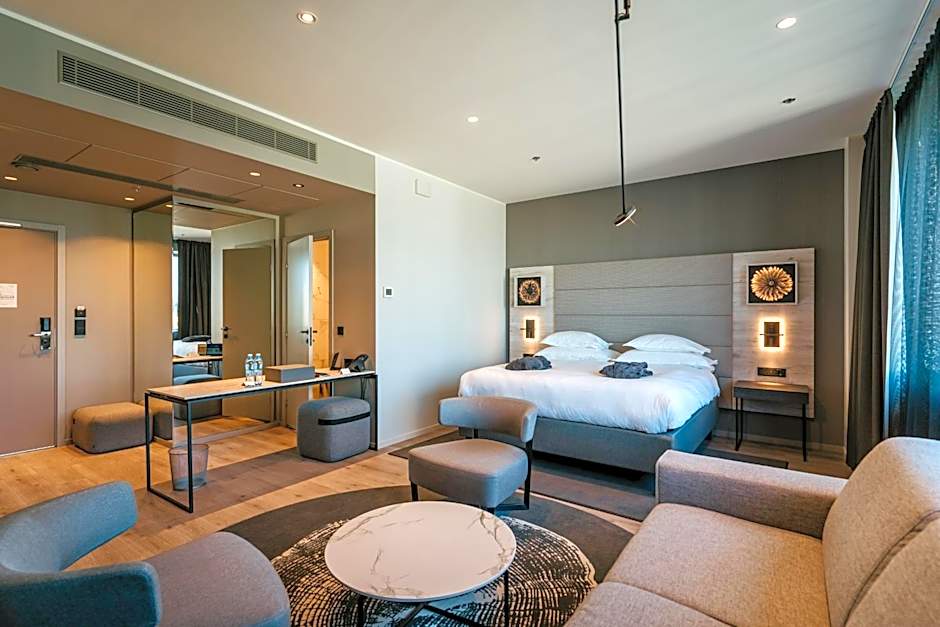 The elegantly spacious air conditioned deluxe rooms are located on the 9th floor of the hotel. Rooms have one large, high-quality continental bed, comfortable seating area with armchairs and a sofa, which can be turned into an extra bed ideal for up to 2 children. All rooms include TV, mini-bar, safety deposit box and blackout curtains and have parquet floor. Bathroom includes bath and hairdryer. Guests are offered bathrobe and slippers. Guests can enjoy free WiFi, blackout curtains, tea/hot drink set, capsule coffee maker, iron, ironing board and yoga mat. The room rate includes a particularly rich breakfast in the City Grill House restaurant, access to the hotel’s relaxation area and the possibility to use a separate workspace.