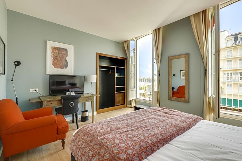 This room has a panoramic view of the ocean and of Place Sainte-Eugénie from its balcony, furnished with outdoor furniture.