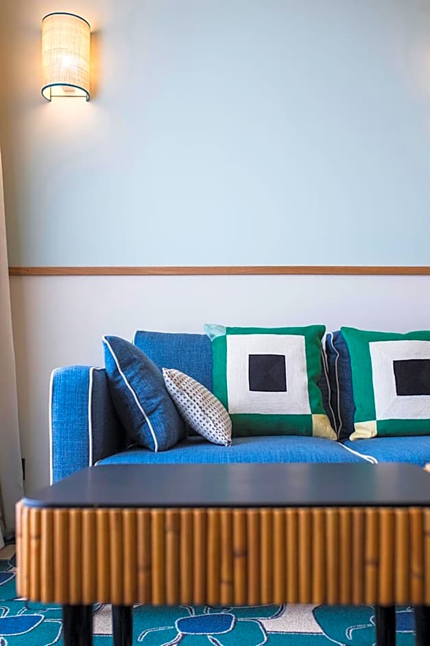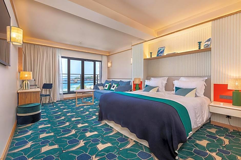 Duplex room, on the first floor, decorated by Maison Sarah Lavoine. Living room with ocean view and mezzanine bedroom with partial ocean view. Bathroom with separate shower and WC.
