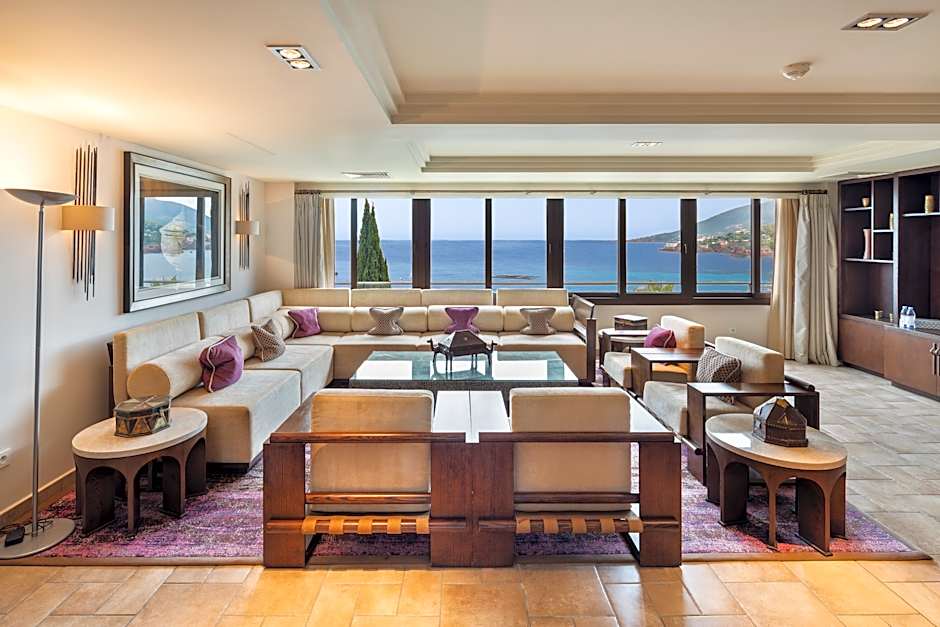The Royal suite is decorated in contemporary/ Mediterranean/ Oriental style. It features a private, furnished terrace with garden views. The large living room has panoramic sea views. It is composed of a lounge, bedroom, dressing room and bathroom with walk-in shower. Additional facilities include a hairdryer, air-conditioning, bathrobes and slippers, mini-bar, satellite TV and free Wi-Fi.