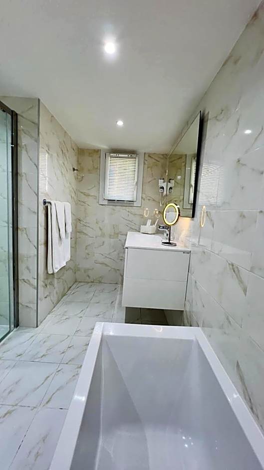 This suite has a spa bath on the terrace and an a bathroom with a bathtub.