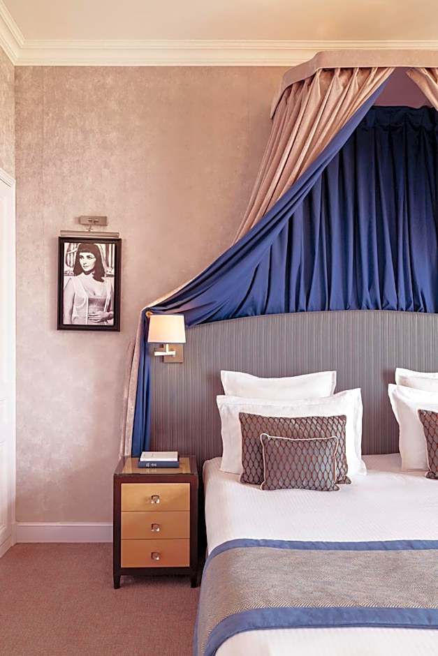 With views of the sea, this air-conditioned suite is decorated in warm shades of colors. It includes a 4-poster bed, a 50-m2 lounge, a dressing room and a bath or separate shower.