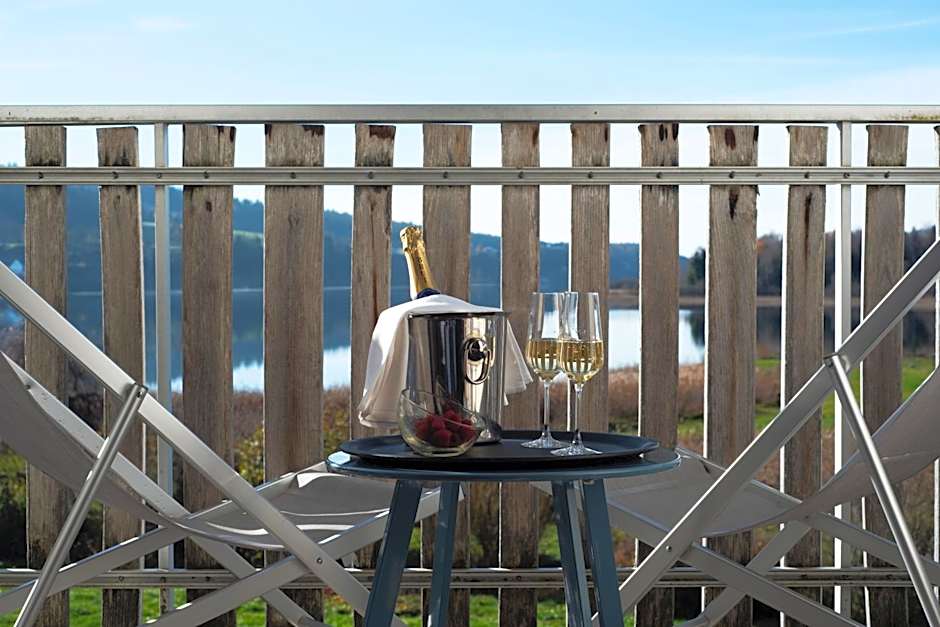 This twin room features a balcony with lake views.
