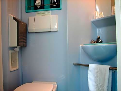 This rooms features a small bathroom with a shower and a toilet.