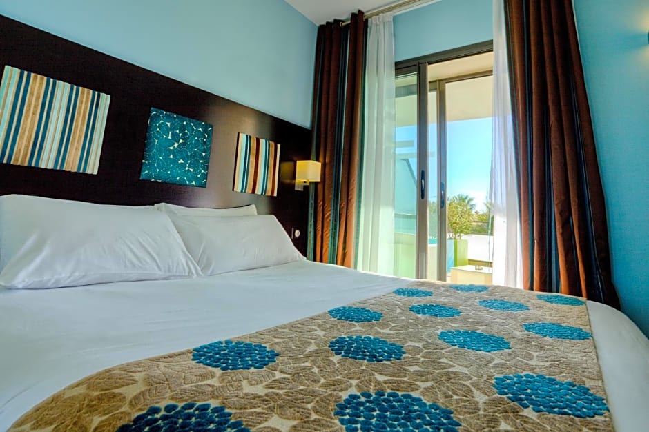 The hotel offers a variety of rooms including Superior Twin Rooms with Garden View, Superior Double Rooms with Side Seaview, Standard Double Rooms, Standard Twin Rooms, Privilège Double Rooms with Balcony and Sea View, Deluxe Rooms with Seaview, and Junior Suites with Seaview. All rooms are non-smoking and have different bed sizes ranging from Twin to King. The rooms can accommodate 2 adults and some can also accommodate 1 child.