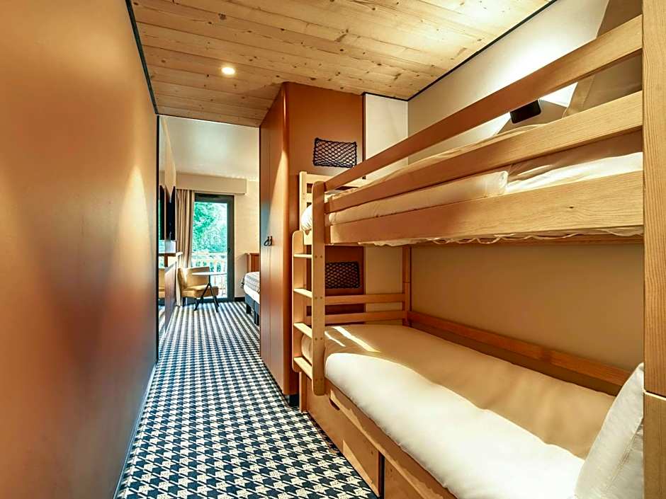 Mountain-style room with a bed of 160 by 200 and two bunk beds, bathroom with separate toilet, mini-bar, safe-deposit box