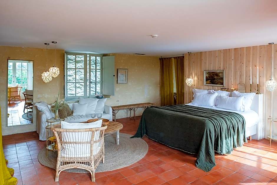 This suite overlooks the Vezere river. It features a king-size bed and a private bathroom with a bath.