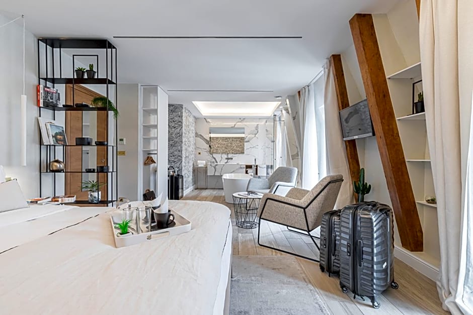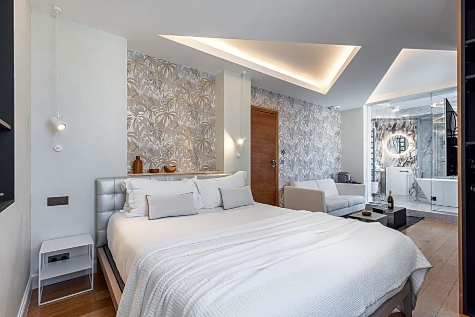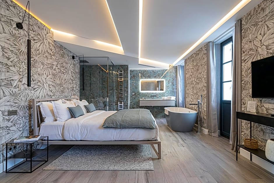 This suite features elegant décor with contemporary details. It has a queen size double bed, a lounge area, a bathroom open to the living room with a walk-in shower equipped with a hammam and a bathtub with a view over the rooftops of Nice.