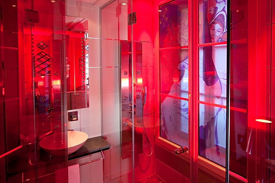 In the style of the Moulin Rouge cabaret, this room evokes the atmosphere of the famous cabaret, through red colors and art work.