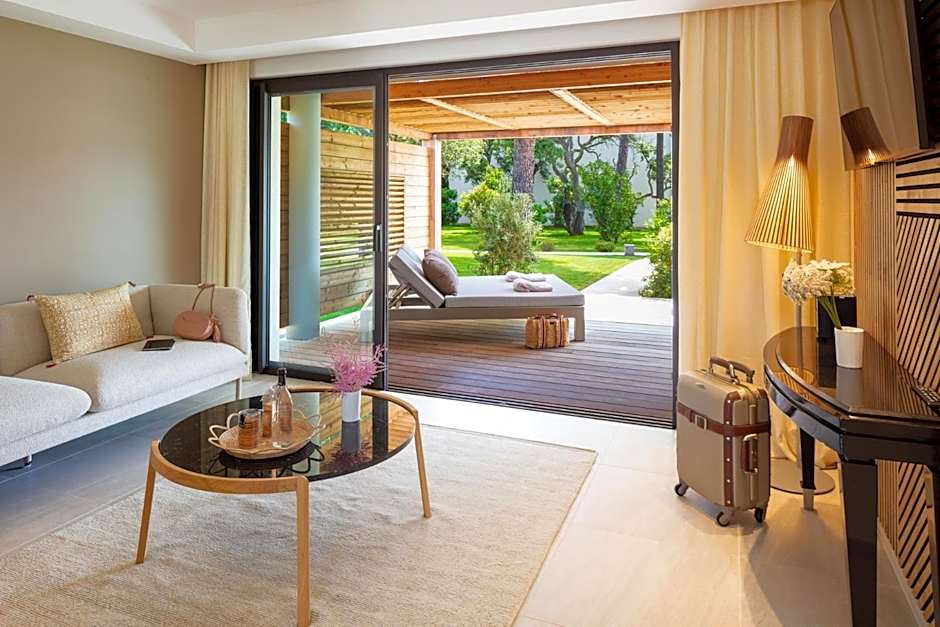A large, air-conditioned suite with free Wi-Fi access, a living area and a terrace with sea views. The marble bathroom offers a walk-in shower and a bath.