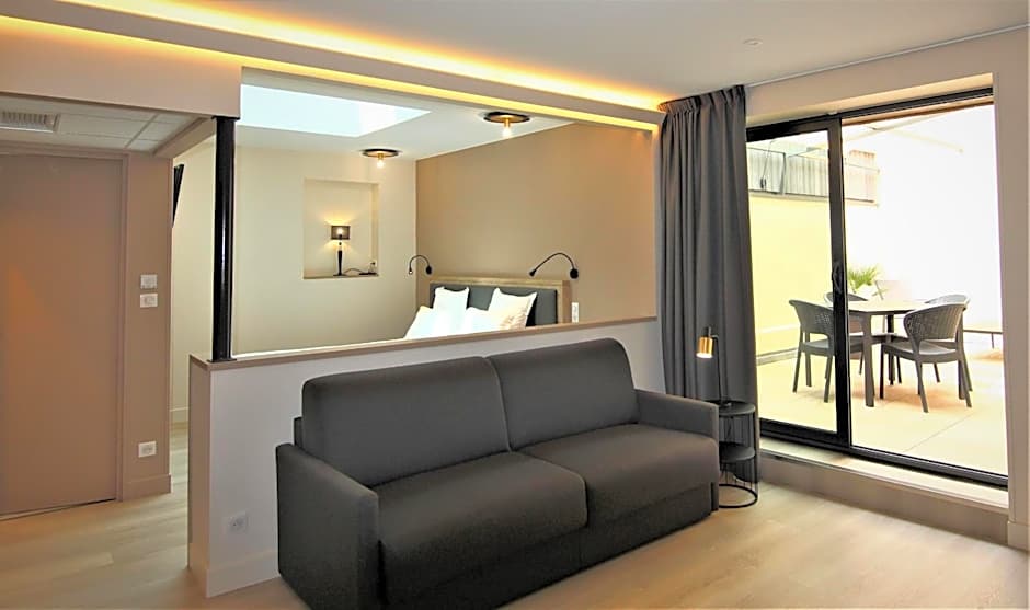 This apartment features an equipped kitchenette with a microwave grill, induction hobs, hood, fridge, kettle, Nespresso coffee machine. Guests also get 2 Nespresso capsules, 2 soluble coffee sticks, 1 tea bag and a herbal tea bag, and 4 sugar pods. There is dish soap and tea towel in the kitchen. A 20 ft² patio, accessible by a large bay window will allow you to take a moment of relaxation or your meals outsid Please note that apartments are cleaned every 3 days during your stay. Guests are responsible for cleaning their own kitchen area.