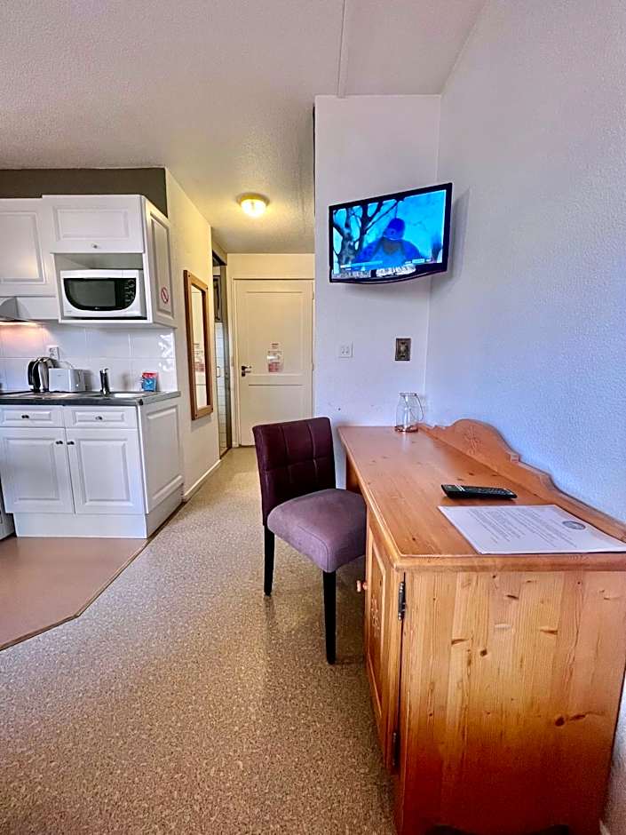 Studio with double bed or 2 single beds on request, equipped with a kitchenette including hob, microwave, refrigerator, coffee pod machine, kettle, safe, TV. Shower room with toilets. Large private balcony (1st floor) or terrace with furniture (ground floor)