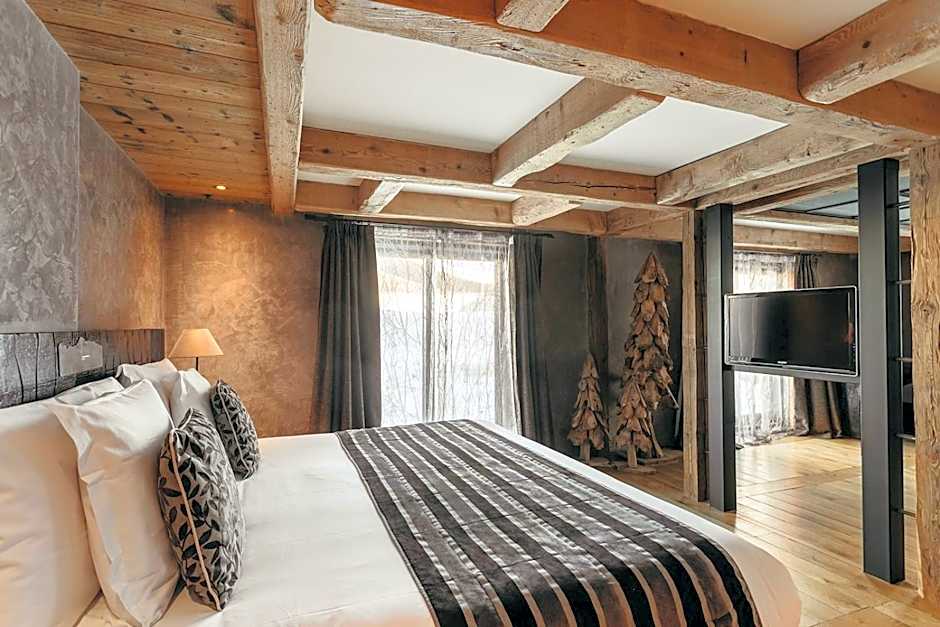 AUTHENTIC & SPACIOUS This 75 m2 suite is composed of two separate bedrooms, the ideal combination for a family stay. The master bedroom has a living room where you can relax and spend some time together, as well as an outdoor space. The sleeping areas are equipped with a shower room for one and a bathroom with balneotherapy for the other. The mixture of old wood, oak floors and rustic furniture will envelop you in an authentic mountain atmosphere.