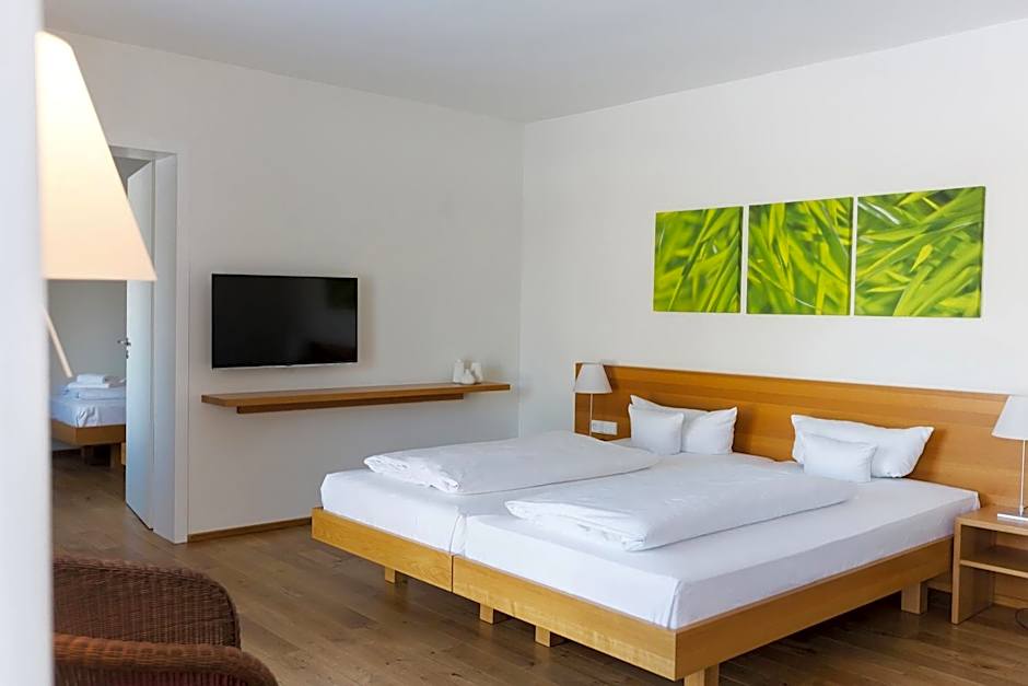 Enjoy a relaxing stay with two people in our comfort double room: here you can enjoy a dreamy view thanks to floor-to-ceiling windows into our parkland, as well as a terrace with sun lounger and seating for relaxation. The modern bathroom is equipped with a double vanity and offers you a choice of shower or bathtub. Four of our comfort double rooms have a connecting door, making them a good option for families too.