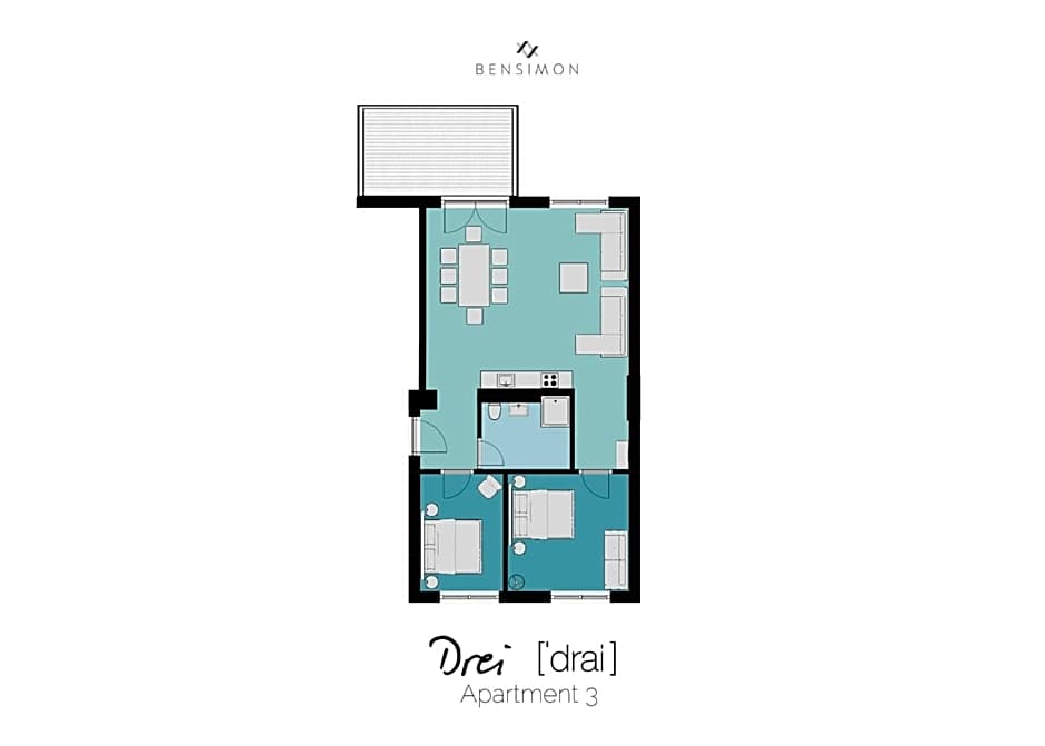 This modern apartment in the attic features a open plan living room with a fully-equipped kitchen, 3 bedrooms and an additional bathroom with bathtub, rain dance shower and a hairdryer.