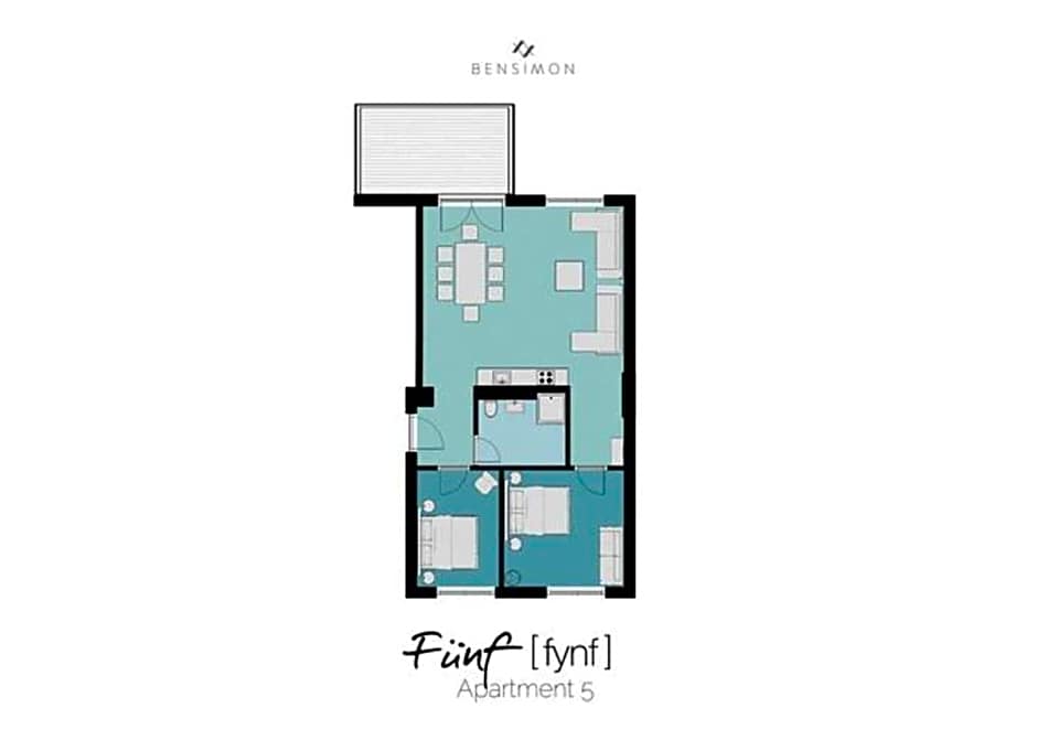 This deluxe apartment can accommodate up to 14 people, and has 4 separate bedrooms with extra large double beds and large double beds. The spacious living room offers a fully-equipped kitchen, a seating area & a terrace to relax. You also find a bathroom with a bathtub and a rain dance shower and an additional guest toilet.