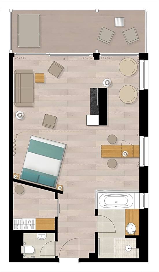 Located on the 3rd floor, directly overlooking the lake and facing the south-west, this beautiful suite offers a 39 ft² balcony with hammock, a separate bedroom, an infrared bench for relieving tension, a cozy lounge area and floor heating.