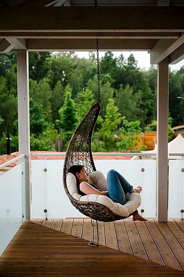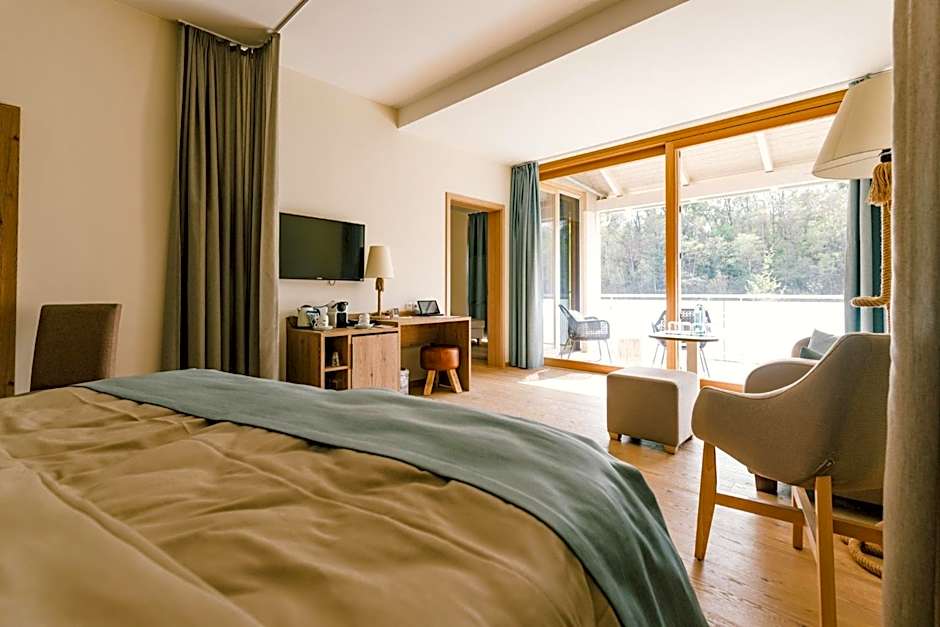 Located on the 3rd floor and directly overlooking the lake, this room features an infrared bench for relieving tension, a balcony with a relax hammock, a Austrian pine cushion for restful sleep, a walk-in rain shower facing the lake, a cozy seating area and floor heating.