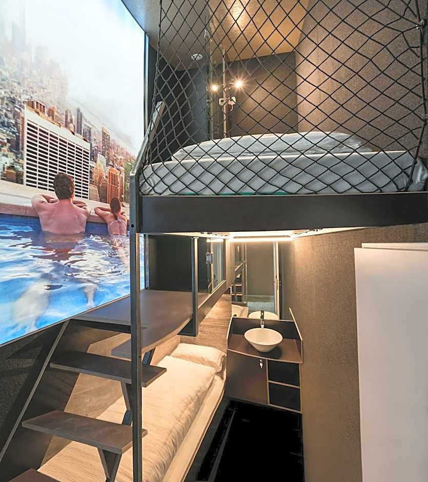 This air-conditioned sleeping box features 1 large single bed (47 in wide) on the upper level and 1 single bed (31 in wide) on the lower level. It also offers a sink.