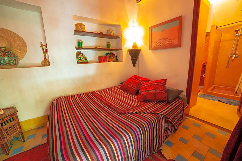 Brightly decorated room with a TV and a private bathroom.