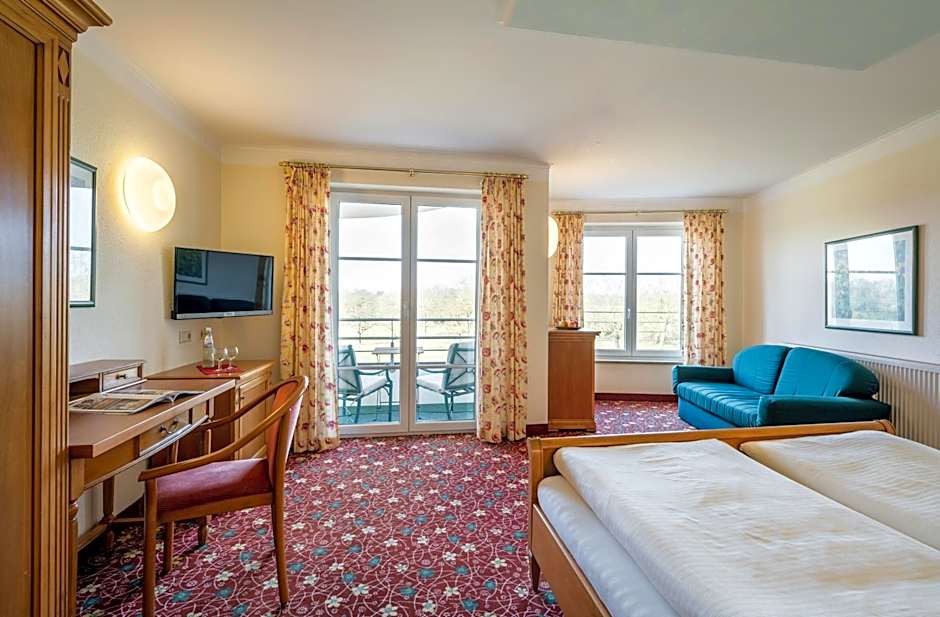 The hotel offers various types of rooms including Large Double Rooms, Double Rooms with Garden View, Doppelzimmer im Souterrain, Double Rooms with Balcony, Deluxe Double Rooms with Balcony, Double Rooms with Terrace, Small Double Rooms, and Standard Double Rooms. All rooms can accommodate 2 adults, with some also able to accommodate 1 or 2 children. Smoking is not allowed in any of the rooms. The bed size in all rooms is a Queen size bed. The room sizes range from 280 sqft to 409 sqft.