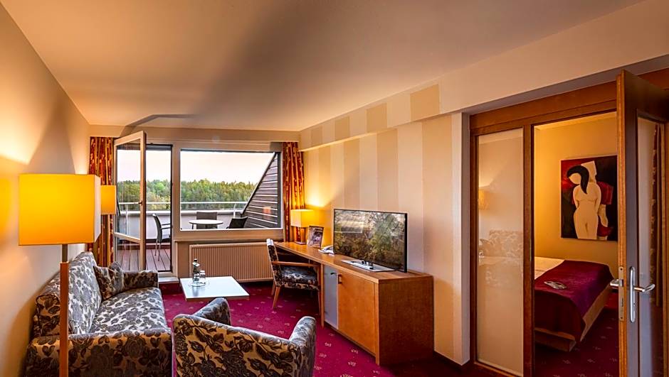 This air-conditioned Junior Suite with with mountain view is equipped with a couch, sleeping area and view of the mountains and the Wehlgrund Valley.