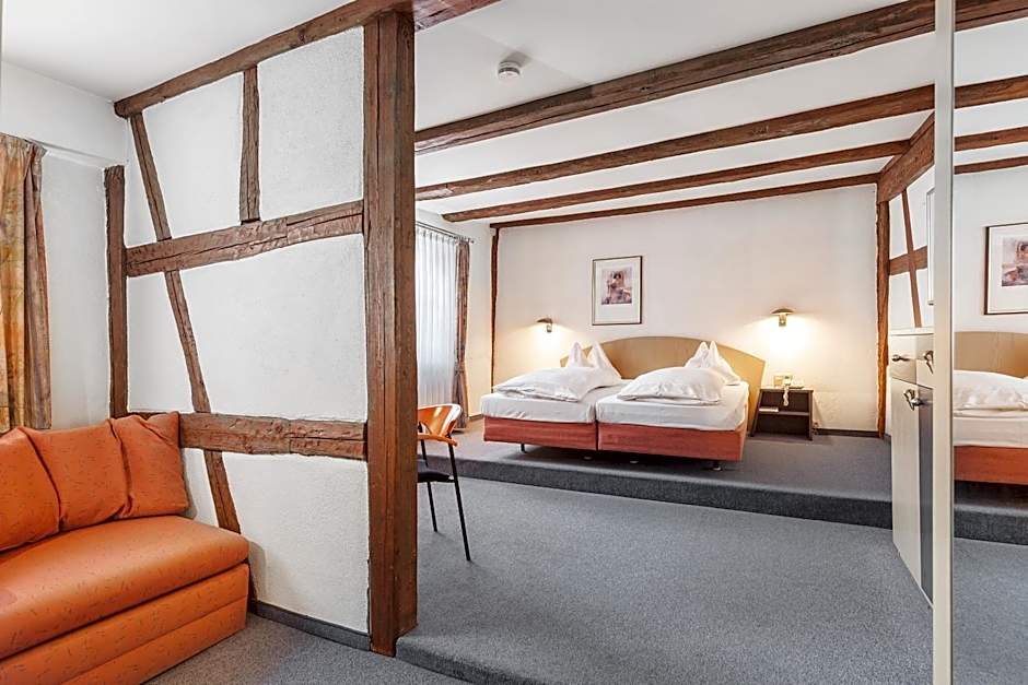 Furnished in classic style in a half-timbered house, this room comes with a double bed, sofa bed, mini-bar, flat-screen cable TV, a telephone, safe and free WiFi. The bathroom includes a bath or shower, hairdryer and a cosmetic mirror.