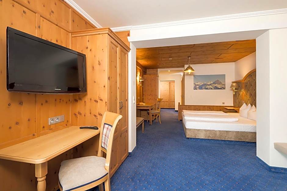 Tyrolean-style room offers flat-screen satellite TV, a seating area and and a balcony with panoramic mountain views.