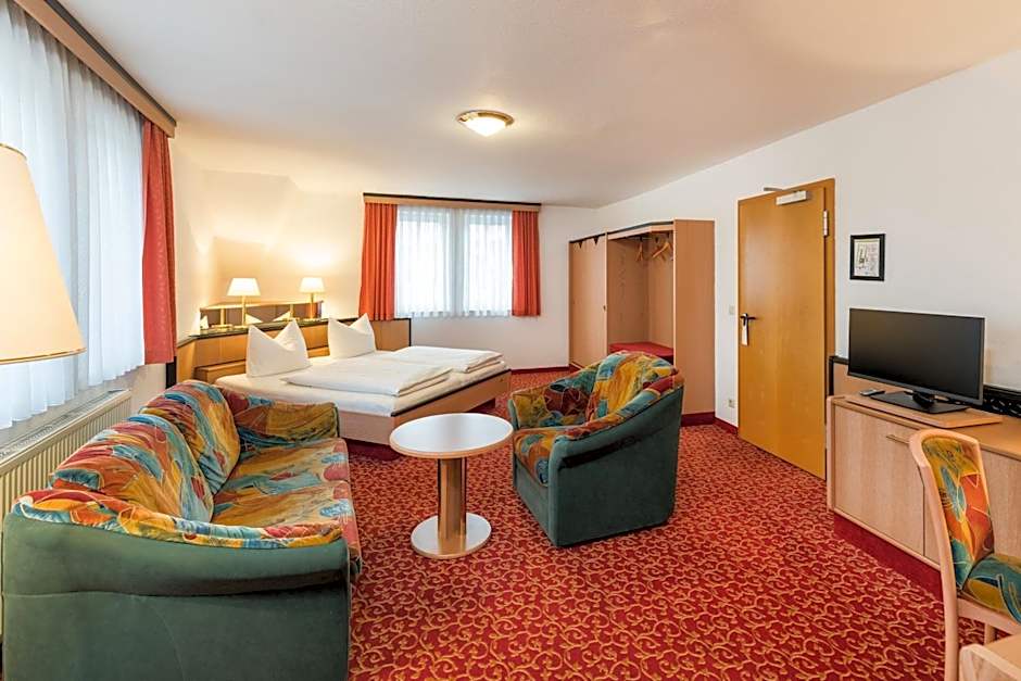Generously furnished comfort double room (approx. 95 ft²) with seating area, double bed size 180 × 79 in, shower/toilet, satellite TV, desk, and Wi-Fi.