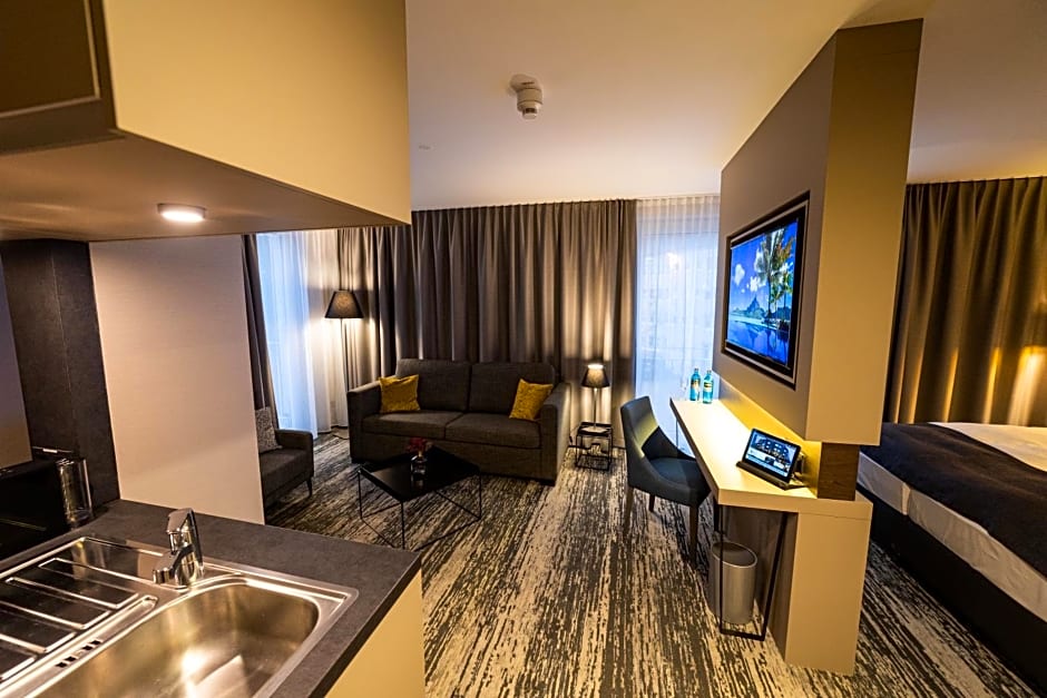 This apartment has a tile/marble floor, seating area and iPad. Please, note that this room type is located in a neighboring building. For check-in, please, visit reception of the Kranz Parkhotel
