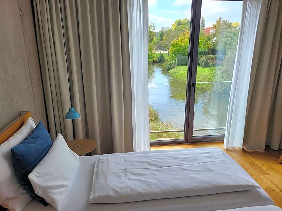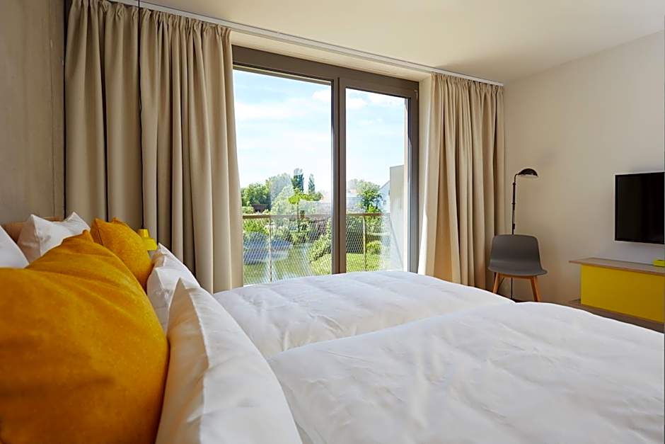 At the Sternen Bohlingen Aparthotel, you have a wide variety of room types to choose from to suit your needs. For those seeking a romantic retreat, the "Abendsonne" and "Im Grünen" apartments offer stunning river views from your private balcony or terrace. These cozy apartments are perfect for two adults and feature a comfortable queen-size bed.