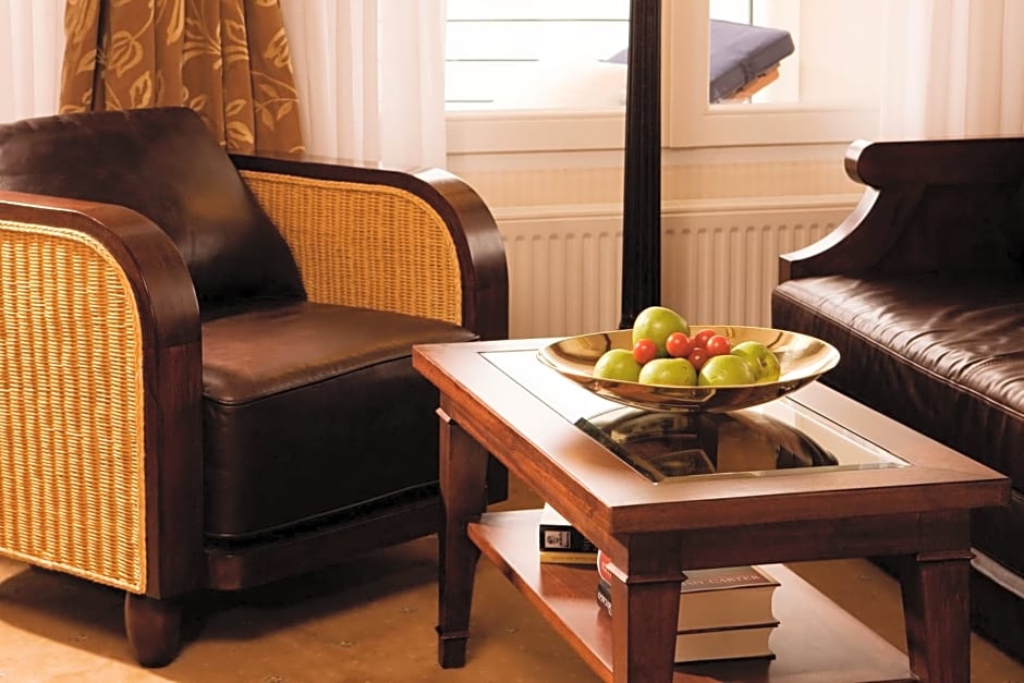 Large suite in the main building with maritime-style décor features an attractive seating area with a library, a flat-screen TV and a luxury, marble bathroom. Also includes a spacious, furnished balcony overlooking the park.