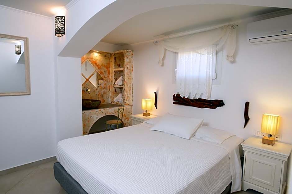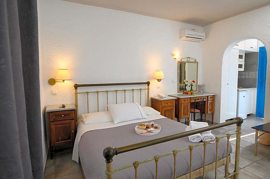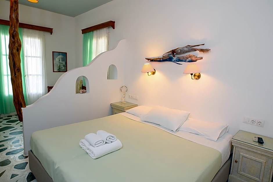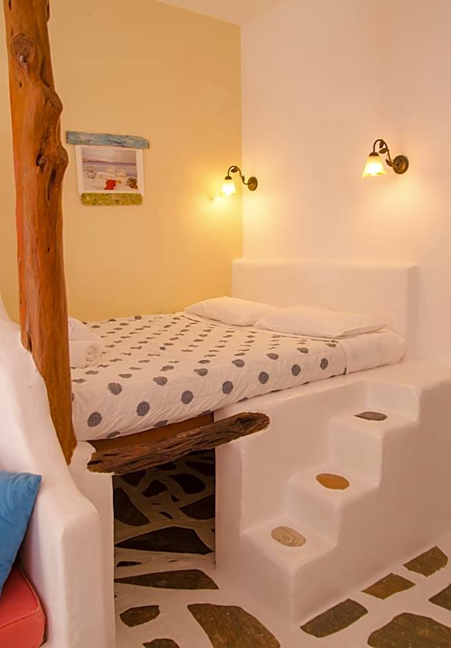 Spacious rooms featuring antique furnishings and a Cycladic-style built-in bed. Please note that, the photo is indicative as all our rooms are different from each other as we are located in a village area.