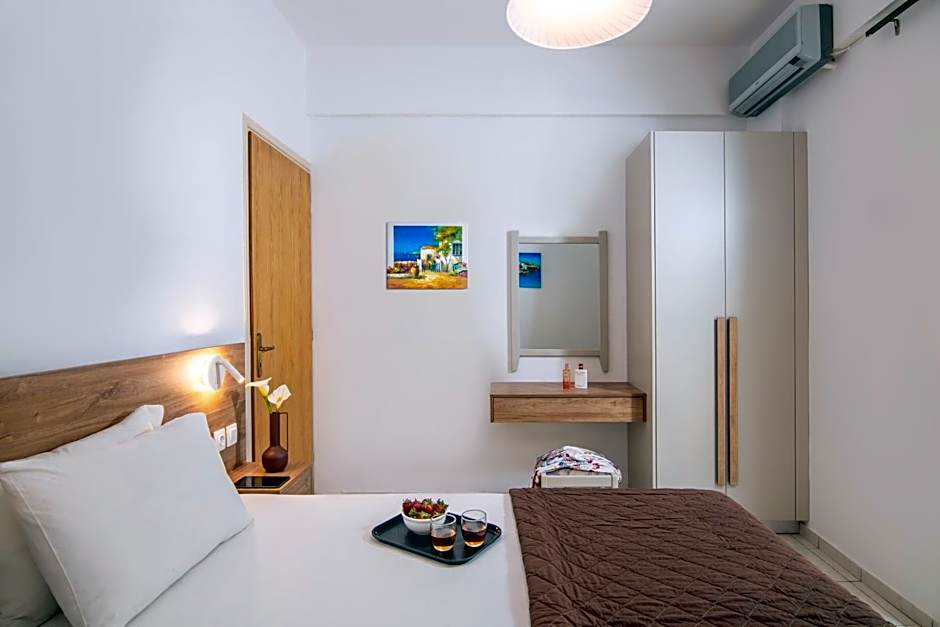 Air-conditioned room with 1 separate bedroom, electric kettle and fridge, furnished balcony and veranda overlooking the Cretan Sea, the garden or the pool.
