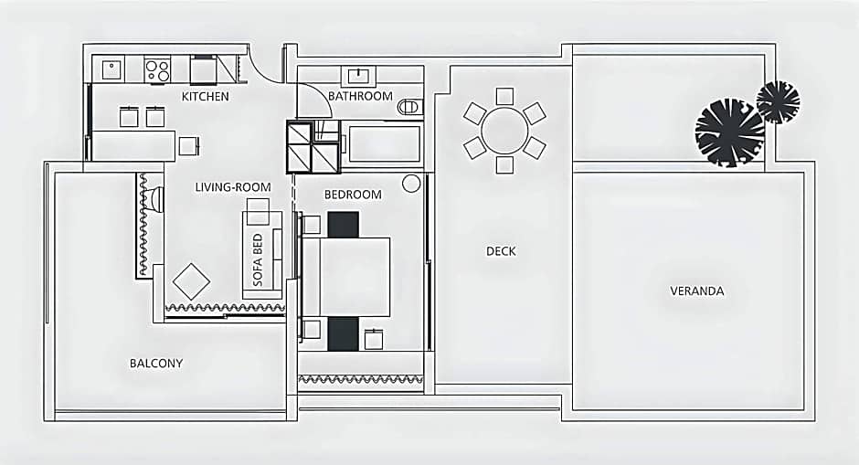 Located on the top floor, this suite opens to a 40-m² private sun deck with sun loungers and city views. The interior covers an area of 164 ft² and consists of a bedroom with king-size bed, a marble bathroom, a fully equipped kitchen and a spacious living room with sofa bed. Facilities include 2 Smart TVs, a CD/DVD player, mini bar, espresso coffee machine and a safe.