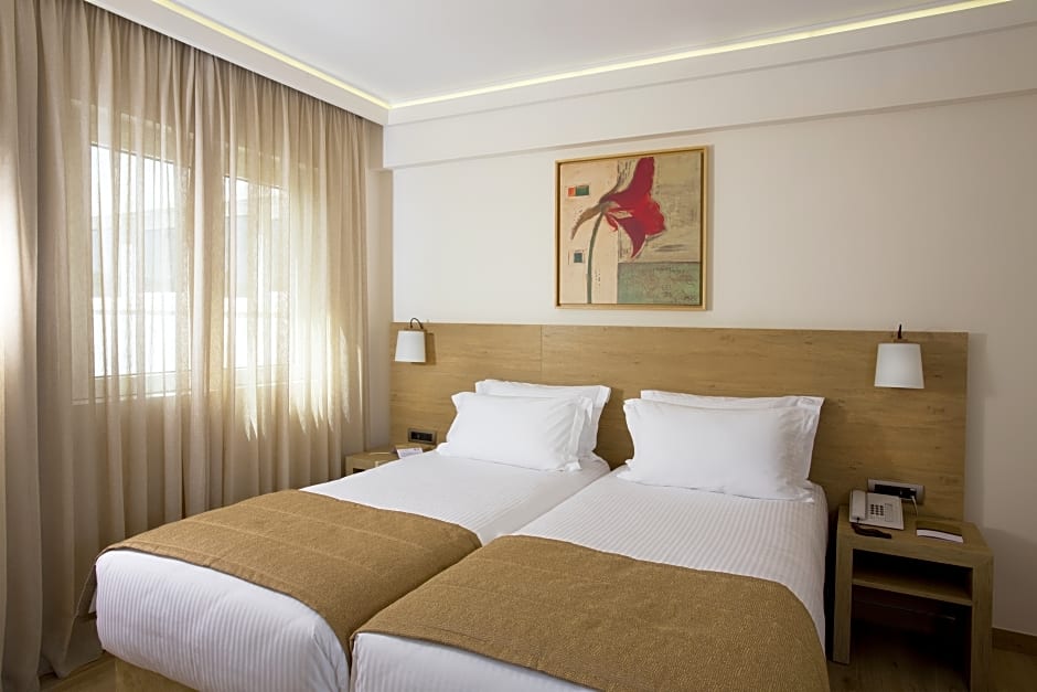 The offers a variety of room types to accommodate different preferences and travel needs. The Family Suite is perfect for those traveling with children, as it comfortably accommodates up to four adults and one child. Featuring two twin beds and one double bed, this spacious suite provides ample room for the whole family to relax and unwind. For a more luxurious experience, the Executive Suite offers a Queen-size bed and a room size of 484 square feet. Couples or small families can opt for the Junior Suite, which can accommodate up to three adults and one child. With its comfortable sofa bed and Queen-size bed, this suite provides a cozy retreat after a day of exploring Athens. Those seeking a more intimate setting can choose the Superior Double Room, which offers a Queen-size bed and a room size of 280 square feet. Finally, the Urban Chic Double or Twin room is perfect for friends or siblings traveling together, with its double bed and two twin beds. Whichever room you choose, you can expect comfort, style, and a great night's sleep at the .