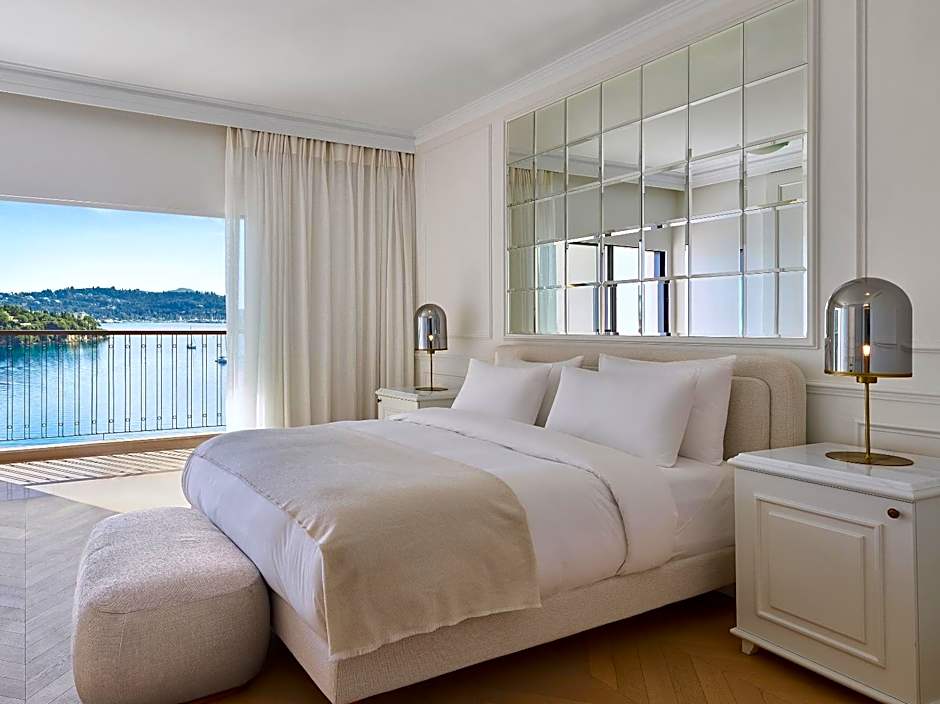 Offering garden and sea views from its floor-to-ceiling window, this elegant room features parquet floors and antique furniture. Some with connecting door.