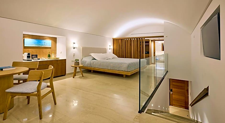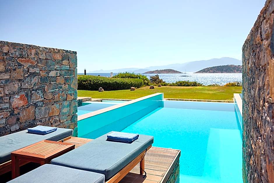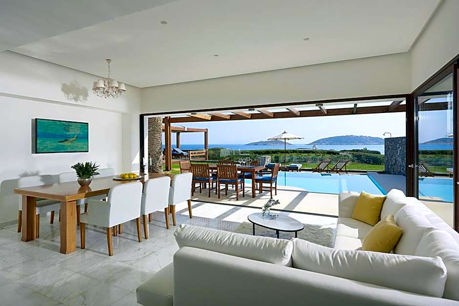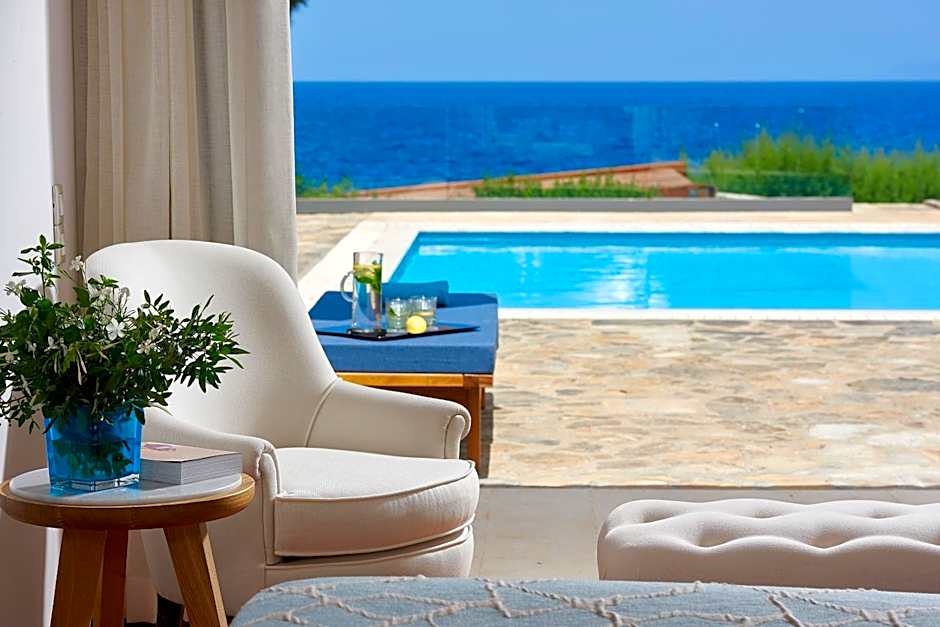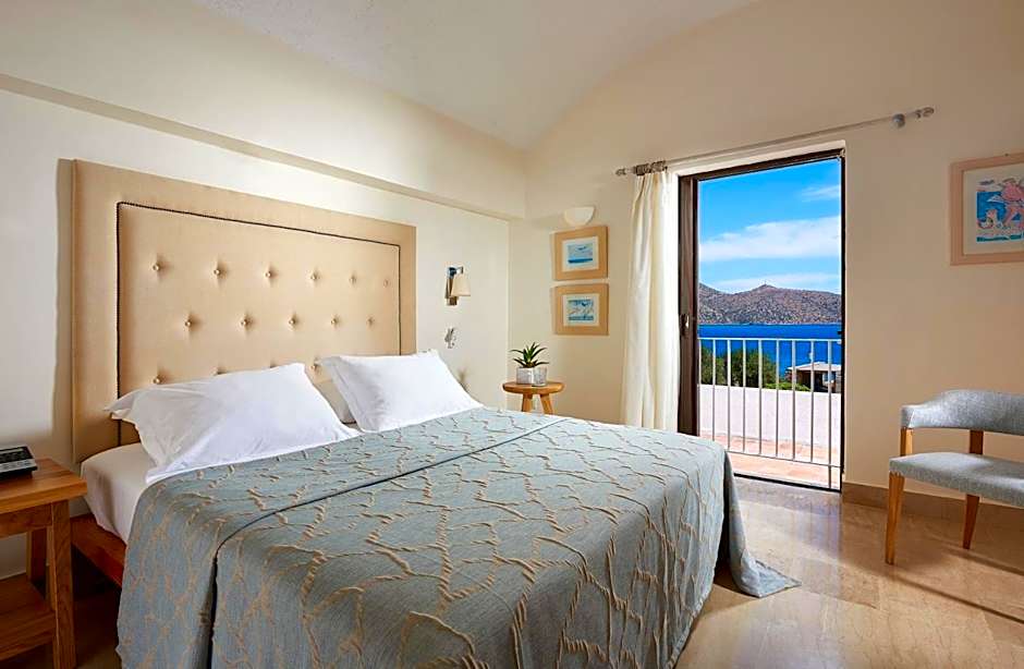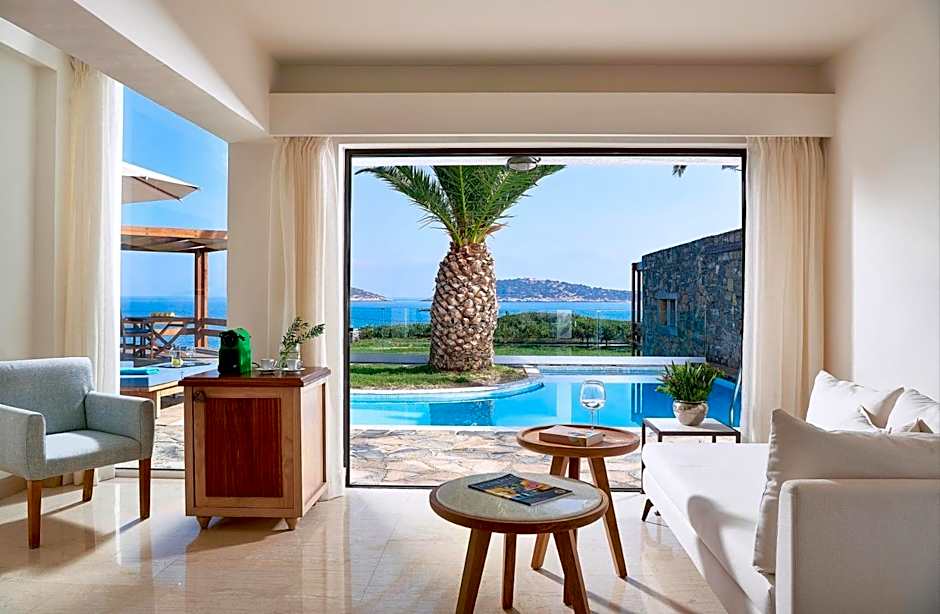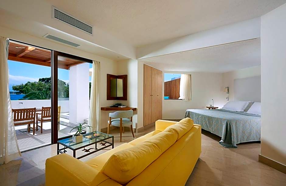 This elegant open-plan suite includes a seating area and a spacious balcony or terrace with panoramic views over Mirabello Bay. It features a marble bathroom with a spa bath and a cabin shower.