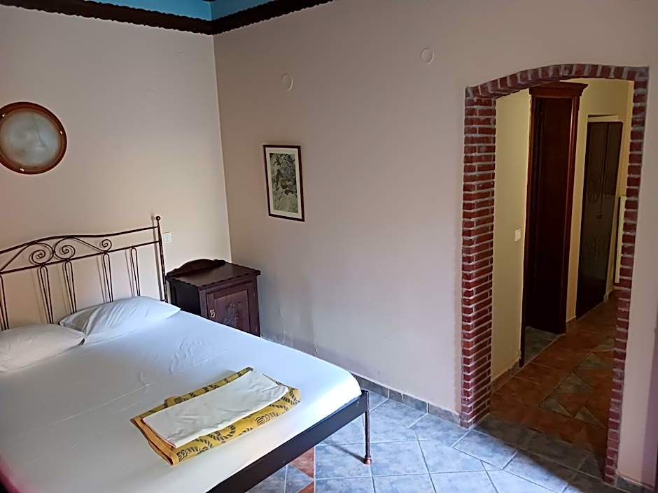 Double room with fireplace, carpets, heating and rustic decor.