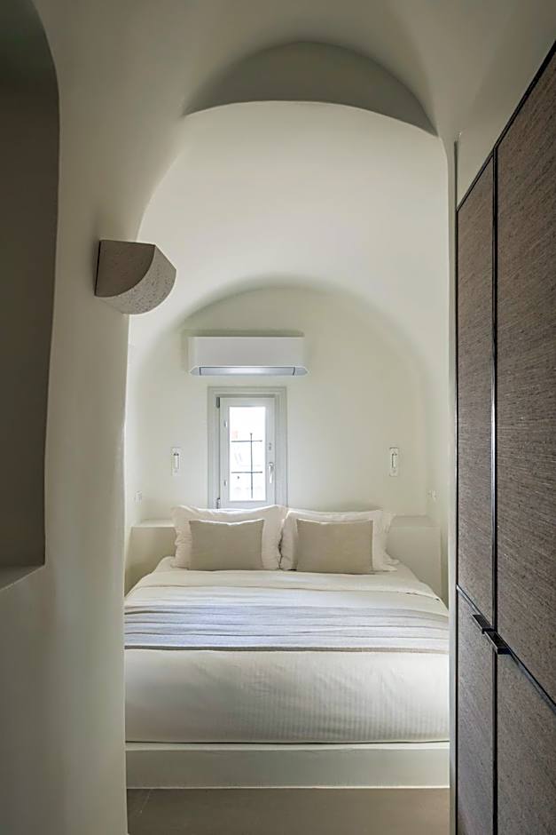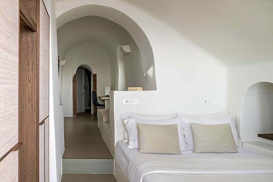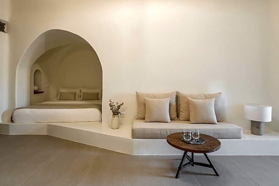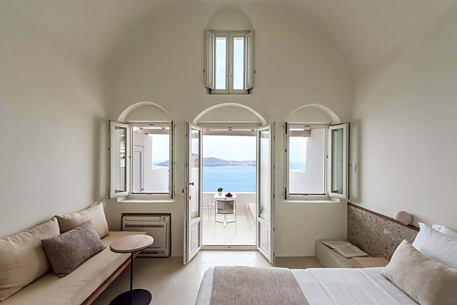 The Junior Suite is located on the hotel’s upper level featuring a double bed with a comfortable natural mattress, two types of optimum quality pillows and exquisite pure cotton linen. A sitting area with a built-in sofa bed, a writing desk, a loft lounge area with a second sofa bed, a bathroom with a shower and luxurious amenities, complete the serene and sophisticated space. The Junior Suite’s private patio with a sitting area offers sweeping views over the deep blue waters of the Aegean Sea and the dramatic volcano to the enchanting golden sunsets.