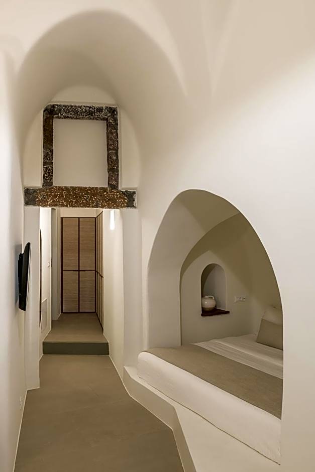 The Senior Suite is located on the hotel’s lower level featuring a master bedroom with a double bed and an open living space with a second double bed, both offering a comfortable natural mattress, two types of optimum quality pillows and exquisite pure cotton linen. An open plan sitting area, a writing desk, two private bathrooms with showers and luxurious amenities, complete the serene and sophisticated space. The Senior Suite’s private patio with a double sunbed and a sitting area offers sweeping views over the deep blue waters of the Aegean Sea and the dramatic volcano to the enchanting golden sunsets.