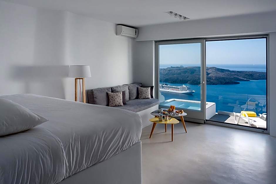 This air-conditioned suite opens to a spacious, private balcony featuring an outdoor hot tub and offering unobstructed views over the Aegean Sea, the sunset and the Volcano.