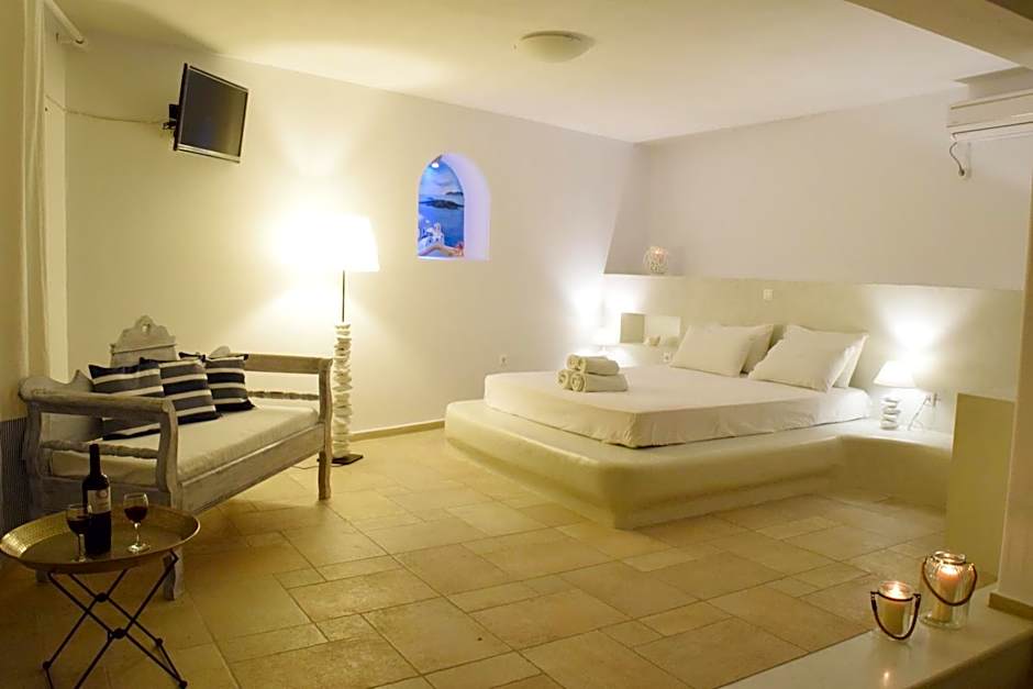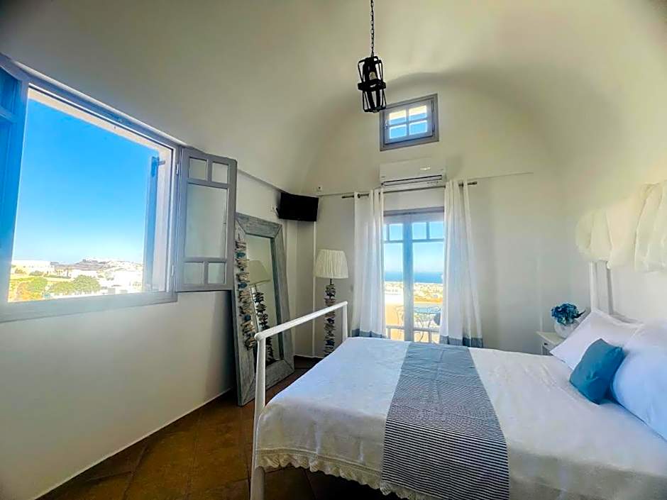 This room has direct access to the garden and features a balcony with views of the Fira Caldera and the Aegean Sea.