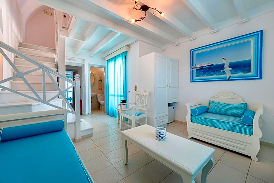 Room options span a mix of styles, from Superior and Quadruple rooms with Caldera View and Hot Tub to suites and family layouts such as Deluxe Family and Suite with Sea View. For larger groups, Maisonette- and duplex-style accommodations provide extra space while preserving the chic, breezy vibe. The overall feel blends contemporary design with classic Aegean charm, perfect for memorable island stays.