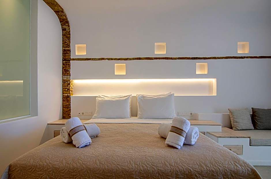 The Deluxe Double Rooms offer a very spacious accommodations option with a floor area of twenty four square yards, with a minimalist esthetic along with a locally inspired design that employs elements of traditional architecture. These rooms have a double bed and offer outdoor seating in a private balcony with a sea view. The design elements and the practical spacious layout of the rooms create a soothing atmosphere. These rooms are one of the most popular choices for our guests that desire a touch of discrete luxury and constitute one of hotel’s best accommodations options for romantic holidays for couples.