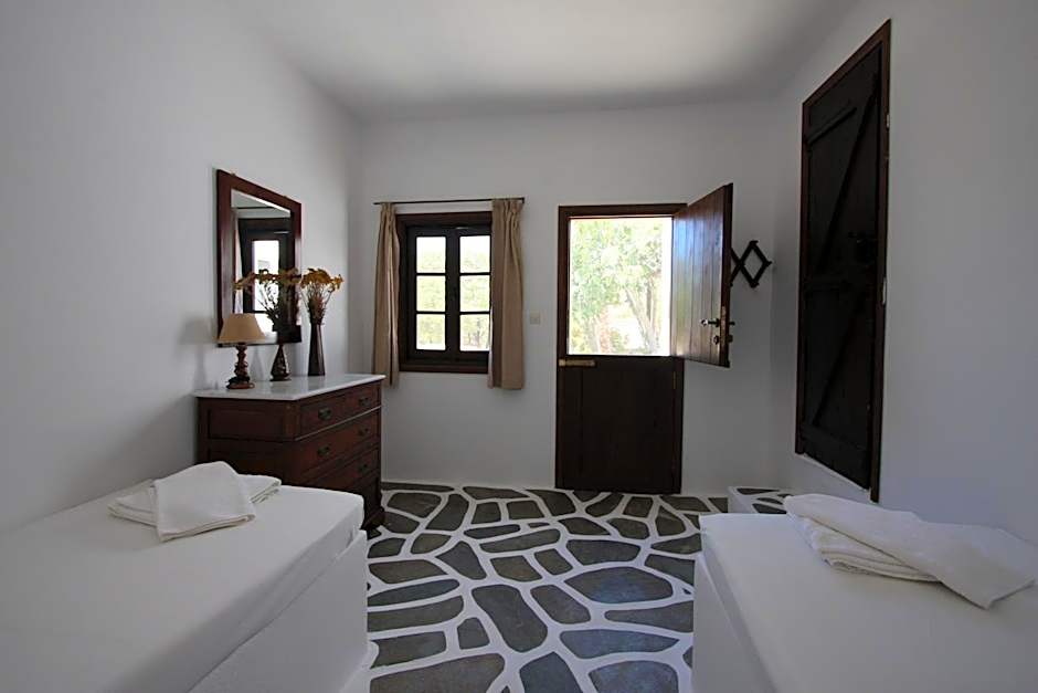 Two attached rooms with a connecting door, one bathroom and a big veranda. The bigger room has a double bed, a kitchenette and a living room area. The other room has two single beds.
